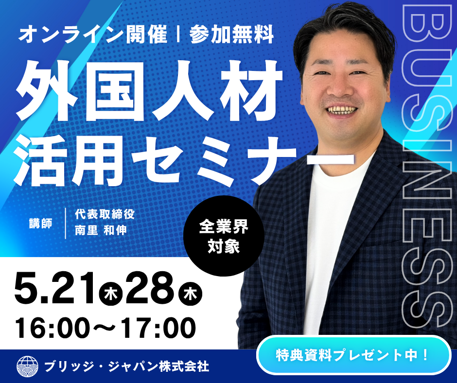 ブリッジ・ジャパンでは、企業様向けに「外国人材活用セミナー」を開催いたします。